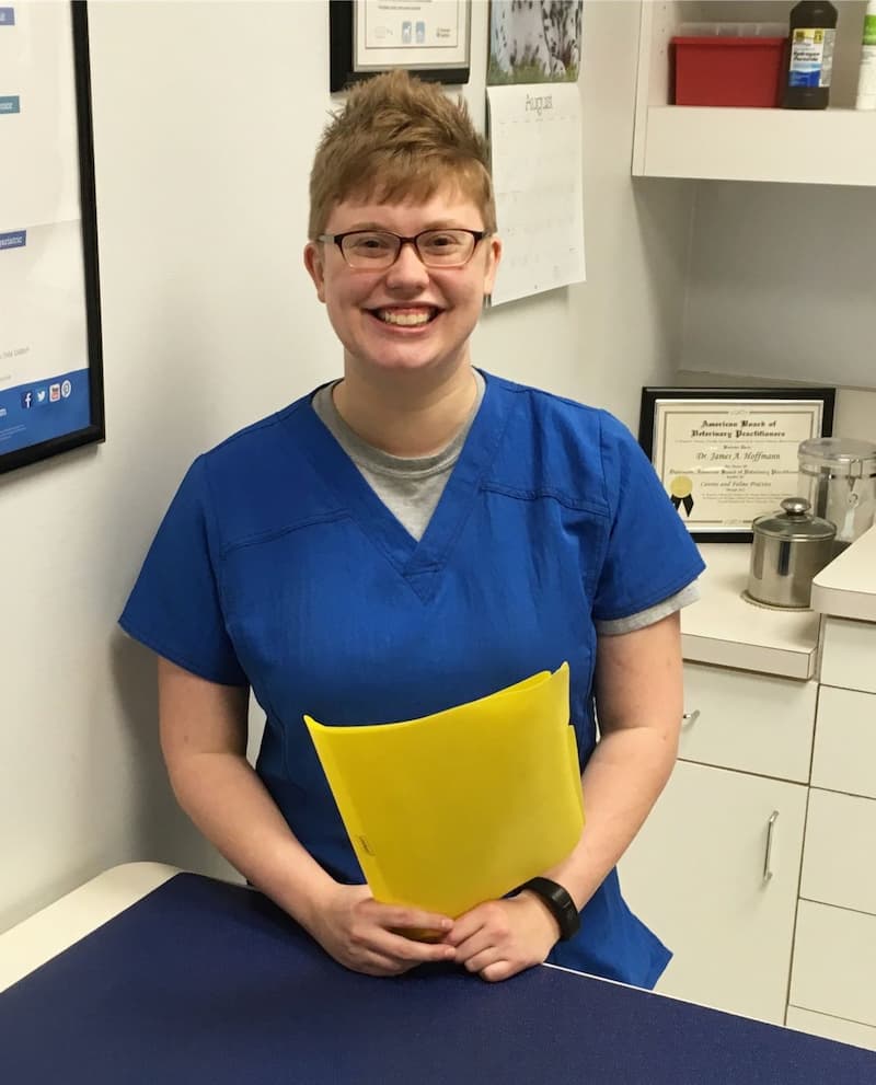 Susan has been a member of our clinic since 2011. She has two dogs- Stella and Sable. Susan likes to read, spend time with her family and dogs, and has a special interest in animal behavior. Susan graduated from the Victoria Stilwell Dog Trainer Academy in 2016 and is currently enrolled in the Penn Foster Veterinary Technician Program. Building relationships with our patients is her favorite part about working at our clinic.